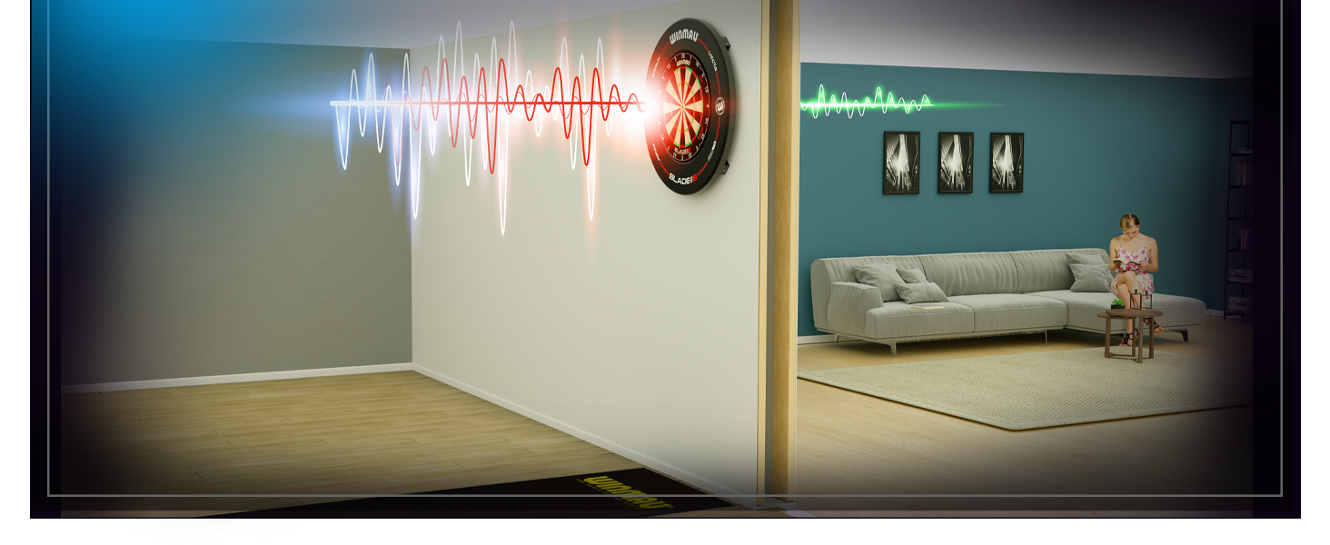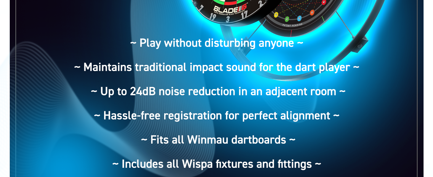 WISPA's radical and patented sound reduction system all but eliminates kinetic sound transfer from darts entry into the dartboard creating the quietest playing system in the World.
