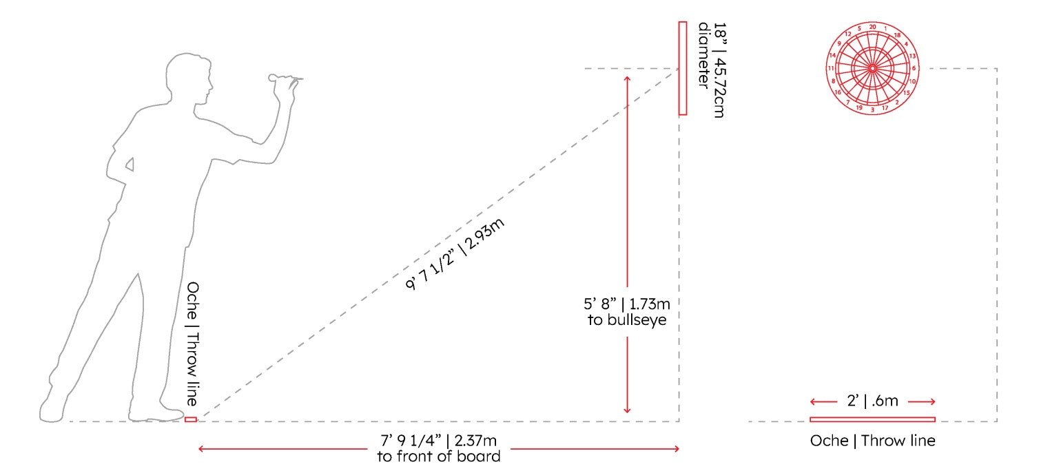 All our dartboards come with clear fitting instructions to help you fit your new product to the wall correctly. When setting your dartboard up, the bullseye should be 5ft 8ins (1.73m) from the floor & your oche (where you throw from) needs to be 7ft 9 ¼ ins (2.37m) from the front of the dartboard. If you are unable to fit your dartboard to the wall, we offer Dartboard Stands with ultimate stability to give you the same experience as if you were throwing at a wall for real. See our instructional set up video below for more!